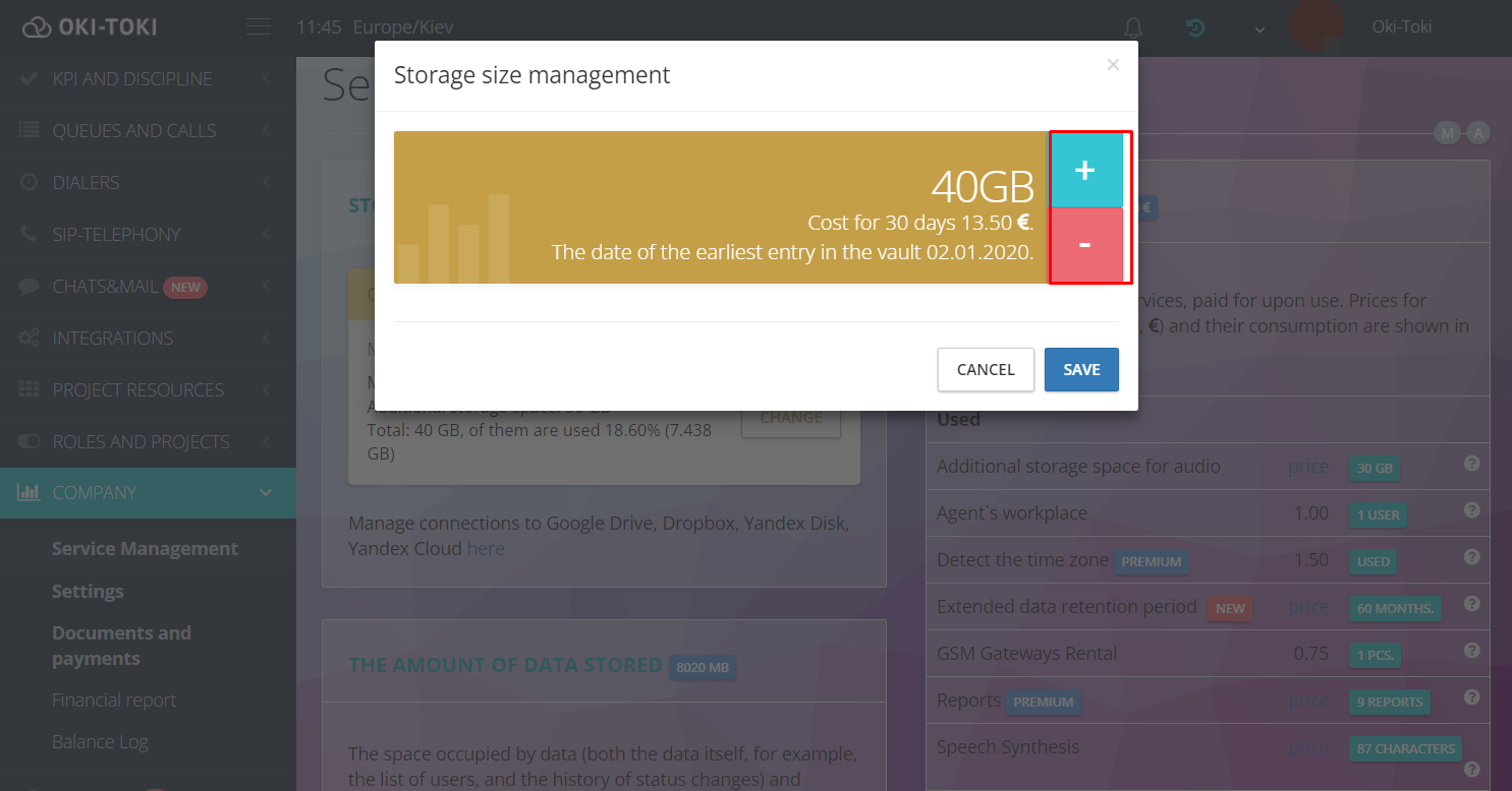 Konuşma kayıtları Oki-Toki serverlarında saklanır. Ana depolama alanı 10Gb, ve fiyatı aylık aboneliğe dahildir. Gerekirse, alanı genişletebilirsiniz. Bunu yapmak için Hizmet Yönetimi bölümüne geçin ve “Ses dosyaları için Depolama” widget’ında “Değiştir” butonuna tıklayın.