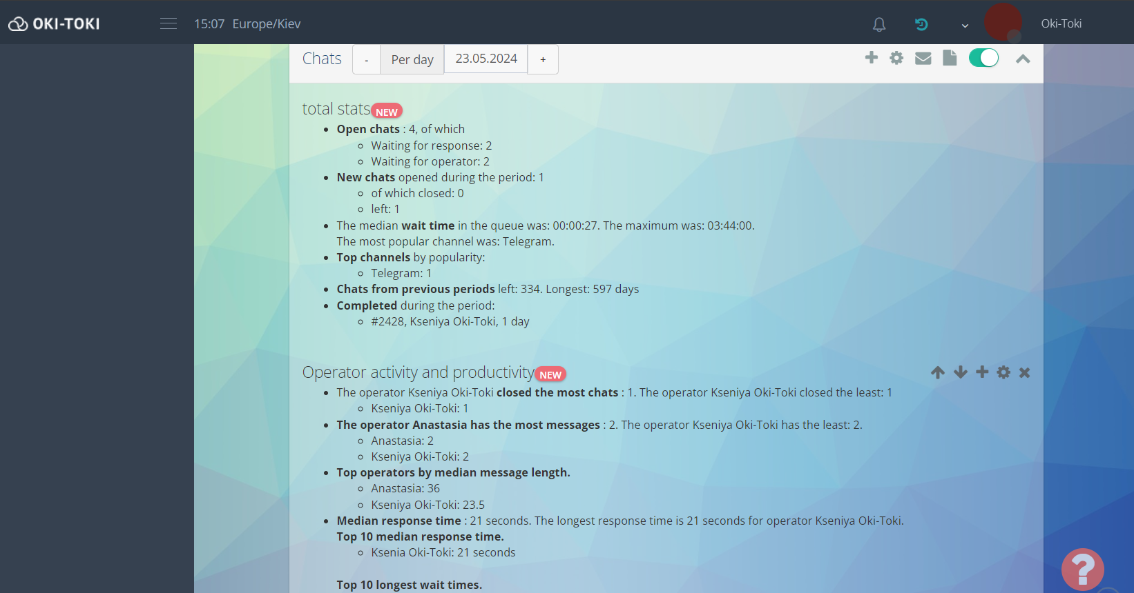 - Sohbetlerde Aktivite ve Verimlilik – Seçilen dönem için kapanan sohbetler, mesaj sayısına göre en iyi operatörler, yanıt bekleme süresinin medyan değeri hakkında özet veriler;