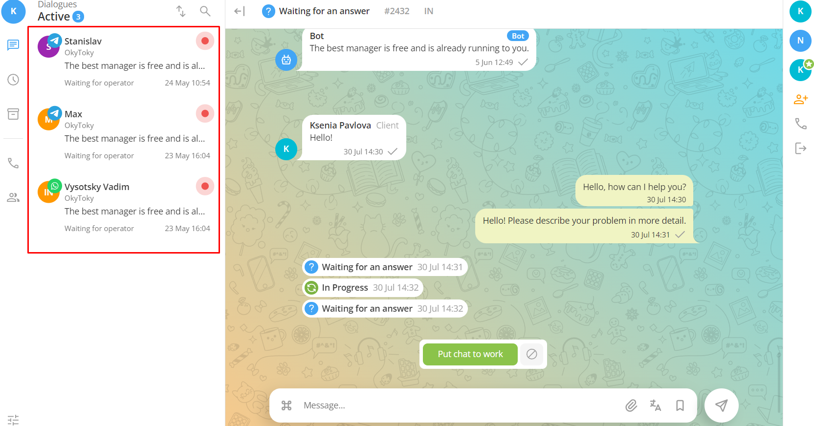 Sohbetlerin basit arayüzü, operatörlerin müşterilerle etkili bir şekilde iletişim kurmasını ve kendi görevlerini yönetmesini kolaylaştırır.Operatörün çalışma alanının fonksiyonelliğini daha detaylı inceleyelim.