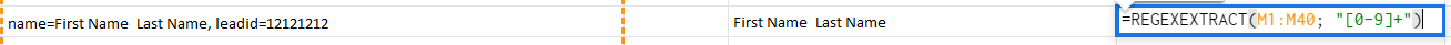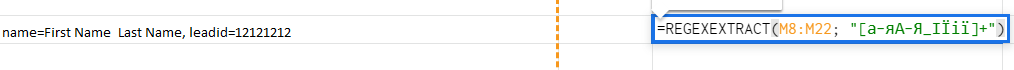 Bunun için formülleri kullanacağız. “İsim_Soyisim” bilgisini bir stringde ararken bize yardımcı olacak düzenli ifadelerle çalışan formül: .=REGEXEXTRACT(M3; “[а-яА-Я_ІЇії]+”). İlk kısmında nerede arayacağımızı belirtiyoruz – veri hücresi (M3), ve ikincisinde arama koşullarını [а-яА-Я_ІЇії]+. Bu şekilde, Ukrayna ve Rus alfabesindeki tüm harfleri (büyük ve küçük harf), ve ayıraç olarak kullanılan özel karakterleri arıyoruz.Formülü bitişik sütuna oluşturup raporun sonuna kadar sürükleyin. Çıkışta, müşterinin adını ayrı bir sütunda elde ederiz.Müşterimizin “lead ID”si için de arama yapmamız gerekecek. Formül şu şekilde olacaktır: =REGEXEXTRACT(M3; “[0-9]+”) veya =REGEXEXTRACT(M3; “leadid=[0-9]+”). Benzer şekilde, hücreyi ve arama parametrelerini belirtiyoruz – tüm rakamlar ve eğer gerekliyse, lead ID’nizi içeren özel karakterler. Sonunda, ihtiyacımız olan bilgiyi içeren ayrı bir sütun elde ederiz (formülü tüm aralığa sürükleyin unutmayın).=REGEXEXTRACT(M3; “leadid=[0-9]+”) için, son ekran görüntüsündeki gibi görünecektir.Tüm adımlar ekran görüntülerinde gösterilmektedir: