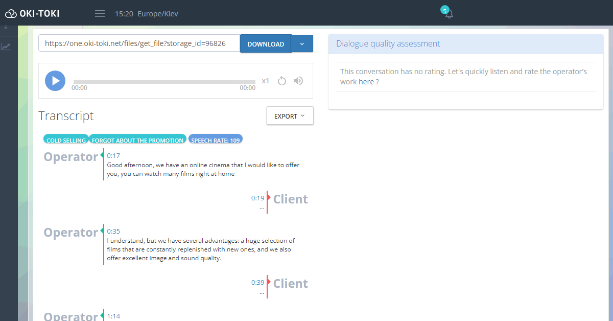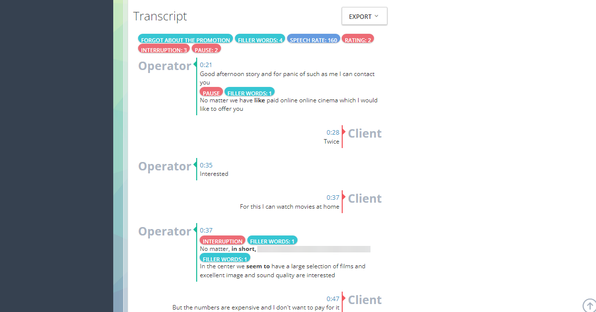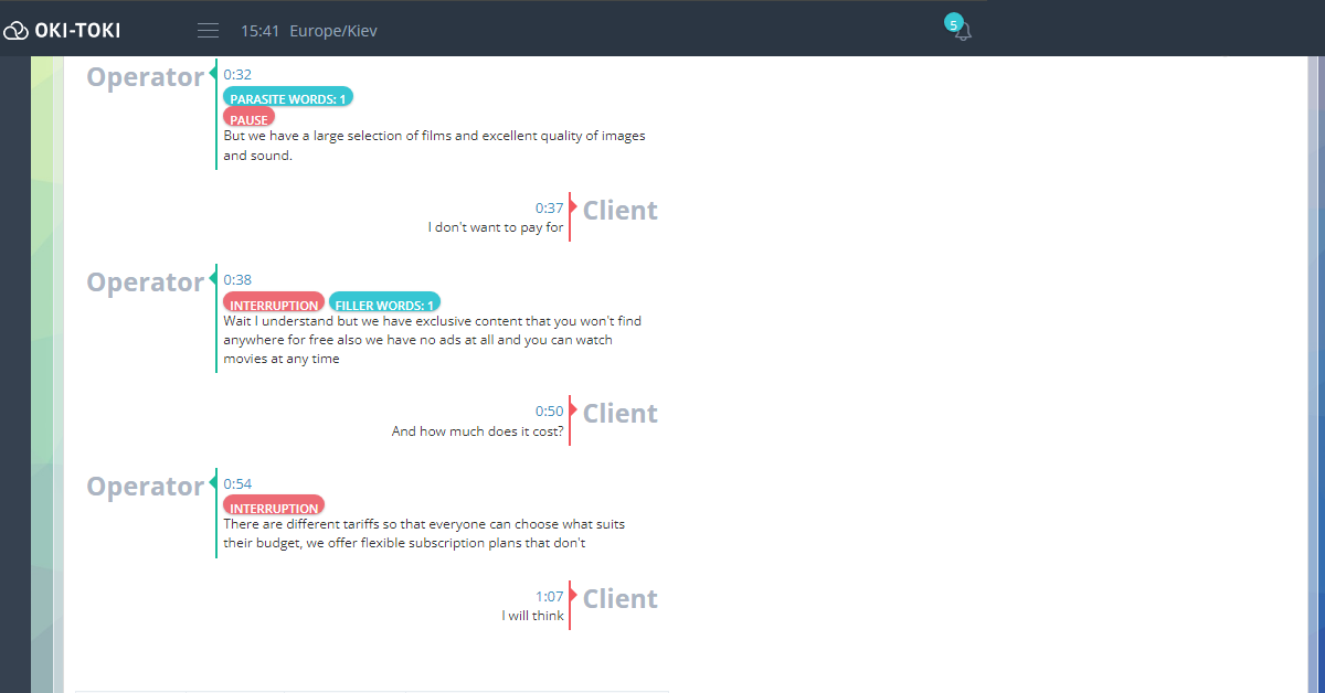 - Müşteriyi kesme. Stenogramdaki konuşma analizi, agnetin müşteriyle konuşmayı kesintiye uğrattığı durumları tespit etmenize olanak tanır. Bu, çalışanın istenmeyen davranışı veya dikkatsizliğine işaret edebilir.