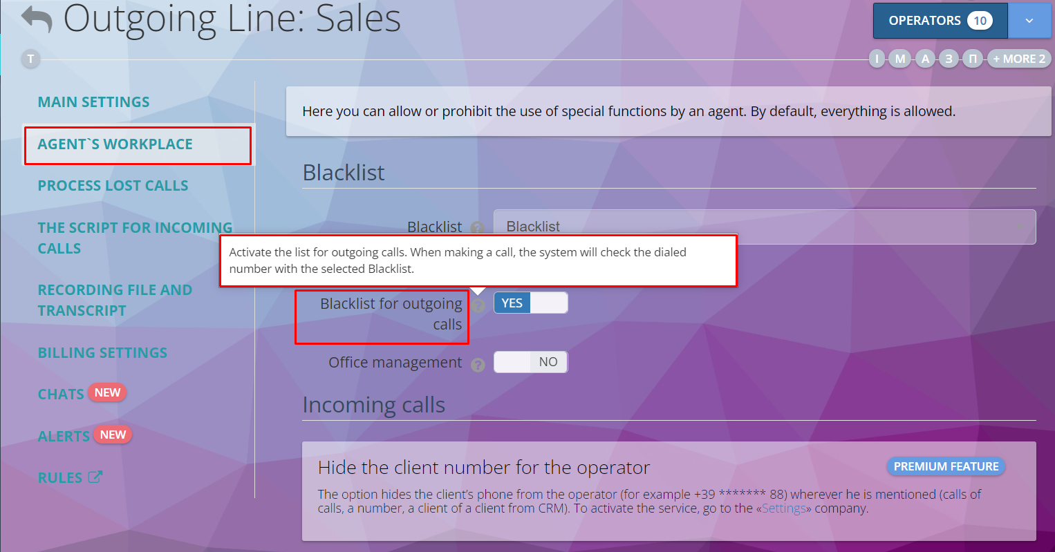 - Yeni bölümde, bir agentın aramaması gereken istenmeyen bir numaraya giden arama yapmaması için Kara Liste seçilebilir. Aktivasyon butonu, bir arama yapıldığında sistemin aranan numarayı seçilen kara listesi ile karşılaştırmasını sağlar.