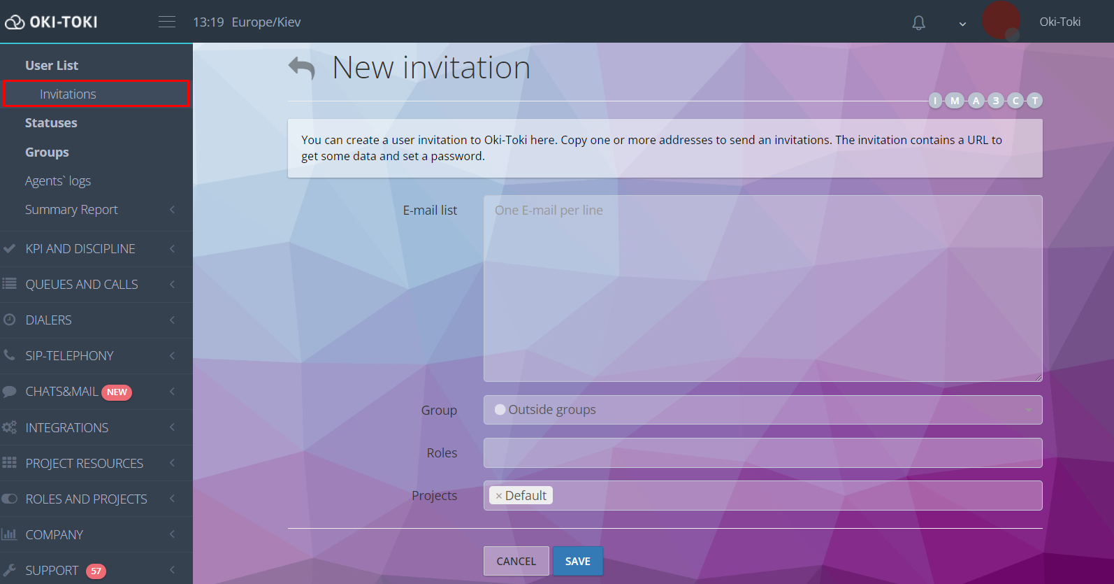 Oki-toki’nin mevcut kullanıcılarını şirketinize aktarma konusundaki eski yöntemden vazgeçtik ve genel bir kitlesel kullanıcı import aracı geliştirdik. Gelecekteki kullanıcıların (hem mevcut hem de yeni) e-posta adreslerinin bulunduğu sütunu kopyalamak yeterli ve alıcılara bir davet mektubu içeren bir e-posta gönderilecek.Bölümün konumu, dış görünüşü ve davet mektubu örneği: