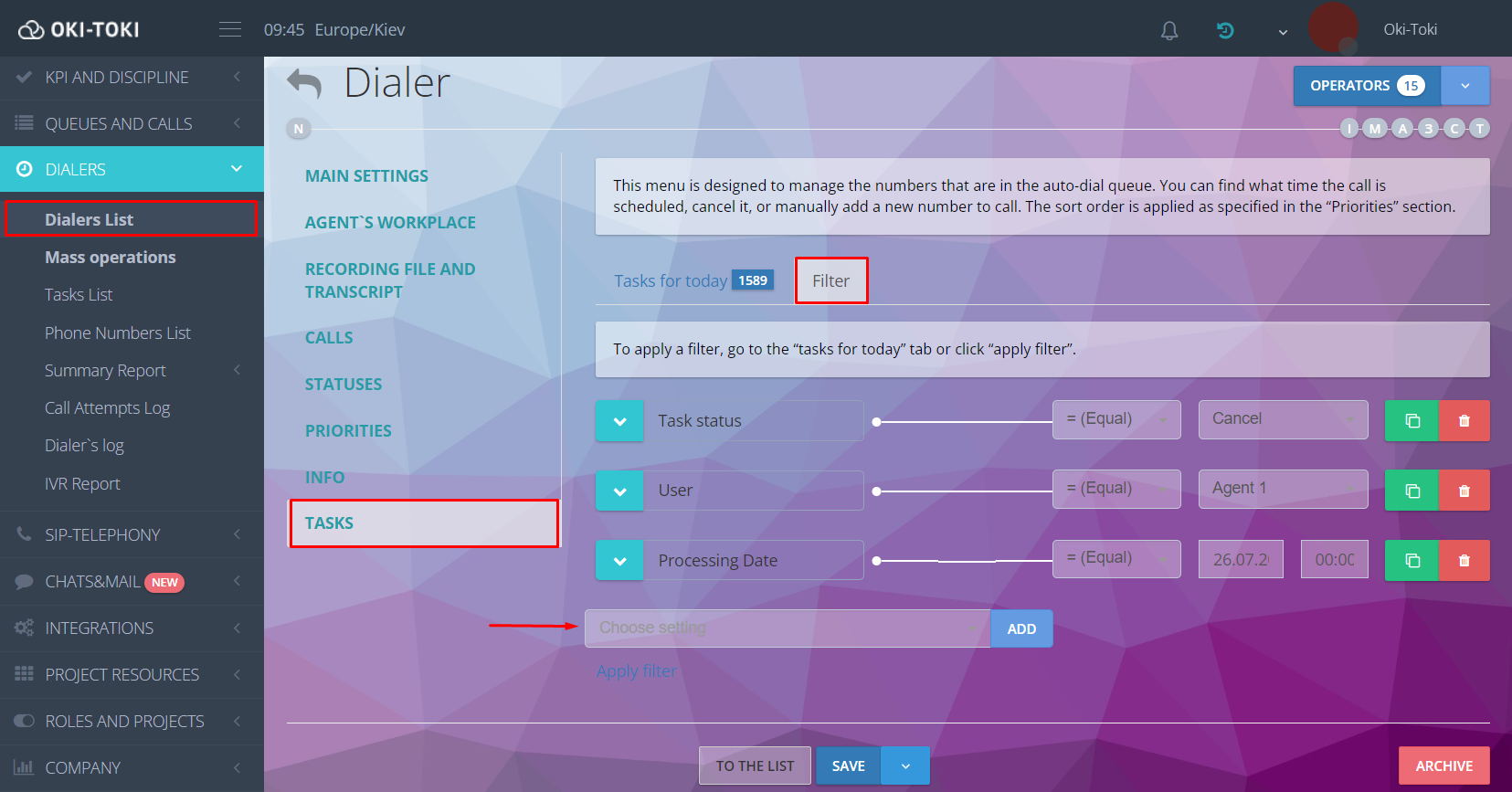 Otomatik arama sistemindeki görevlerin filtreleme özelliği geliştirildi. Önceden, filtreleme sadece bir sonraki arama zamanını ve telefon numarasını seçmekle sınırlıydı; artık sorumlu kullanıcı, saat dilimi, ithalat numarası ve diğer kriterlere göre de filtreleme yapabilirsiniz.