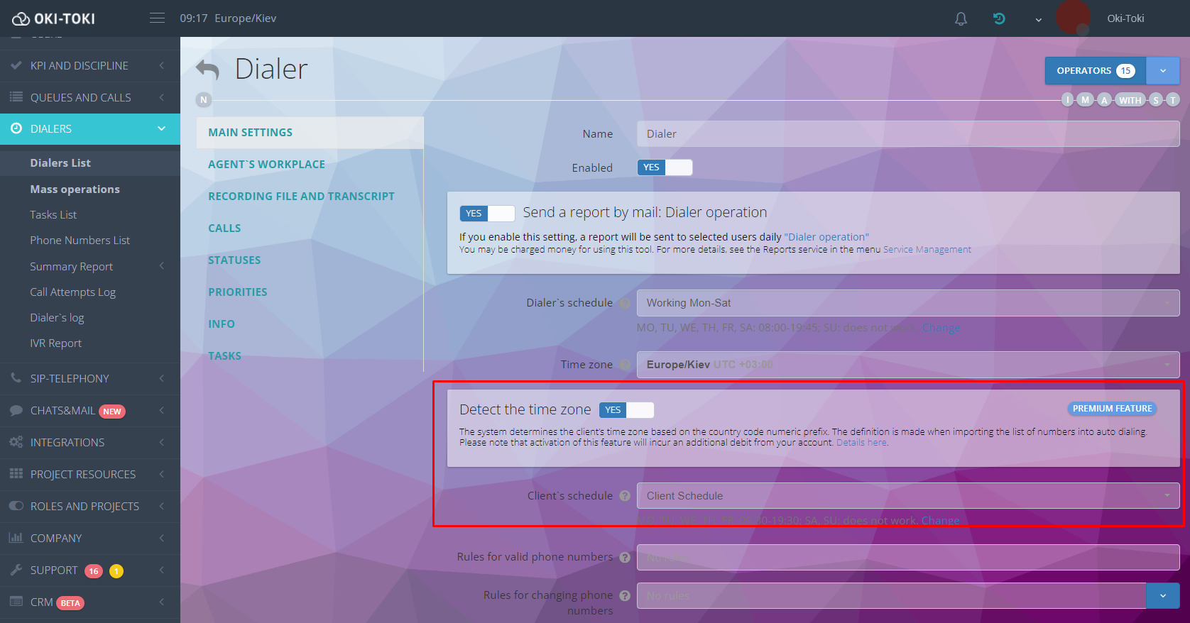 Manuel giden aramalar için saat dilimi belirleme özelliği ekledik. Aramaları ve saat dilimi belirlemeyi buradan (ekran görüntüsüne bakın) yönetebilir, CRM anketinde kullanabilirsiniz. Artık müşterileri beklenmedik zamanlarda rahatsız edici aramalardan koruyabilir, ve CRM anketindeki zaman belirlemesi, zaten akşam olan aboneye iyi sabahlar demenizi engelleyecektir 🙂