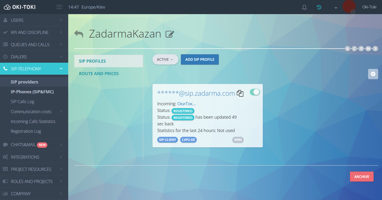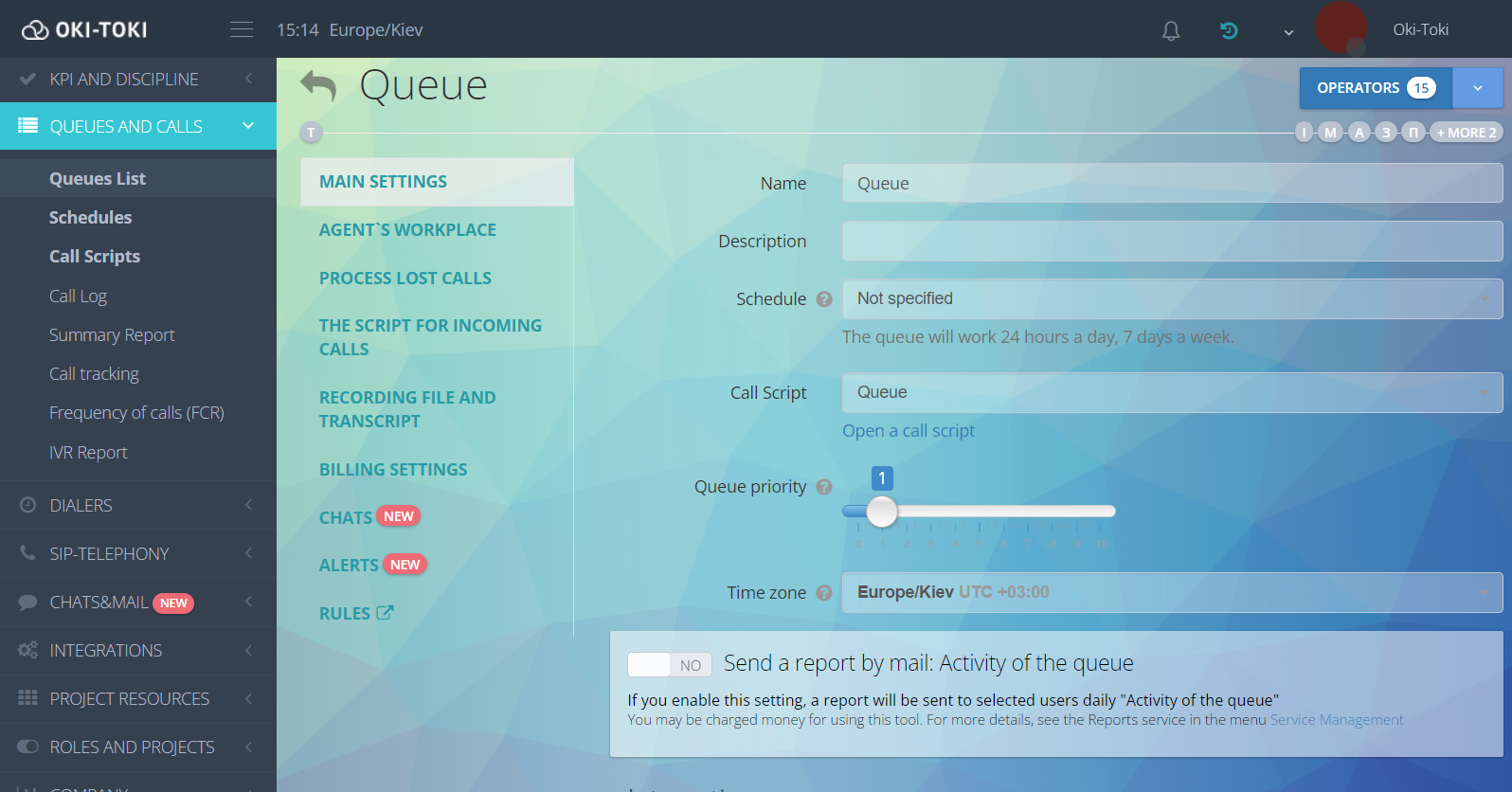 - Sol panelde, agent istasyonunun ayarları, kaçırılan çağrılar, kayıt dosyaları ve stenogramlar, tarifeler, sohbetler ve normlar için bölümler bulunmaktadır;