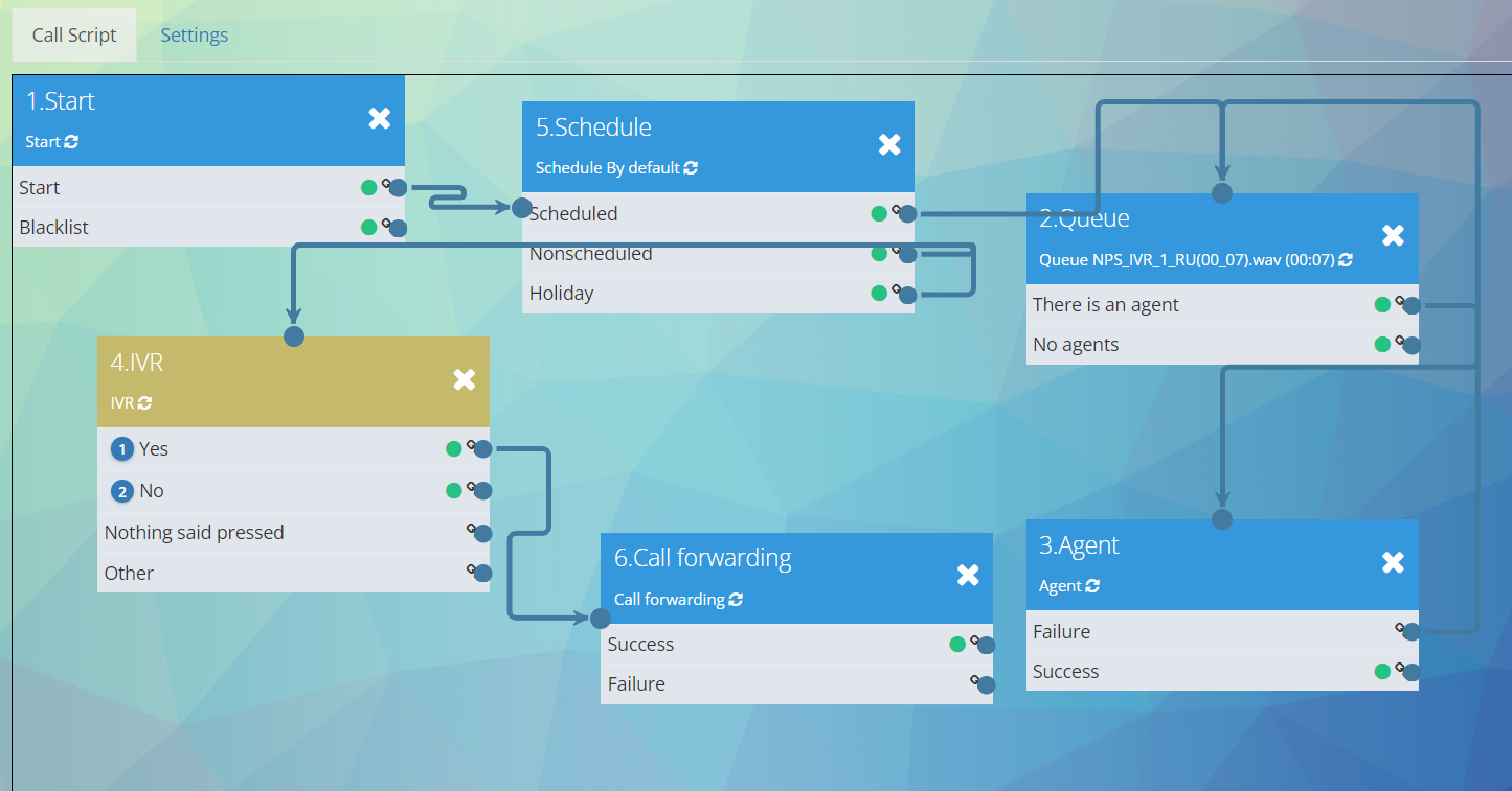 Arama scripti, gelen çağrılar için gereklidir, bu, çağrının hangi yoldan gideceğini belirtir. Yani müşteri hattınıza düştüğünde, çağrının izleyeceği şema oluşturulur. Arama scripti, çeşitli aşamalardan (çağrı aşamaları) oluşur.