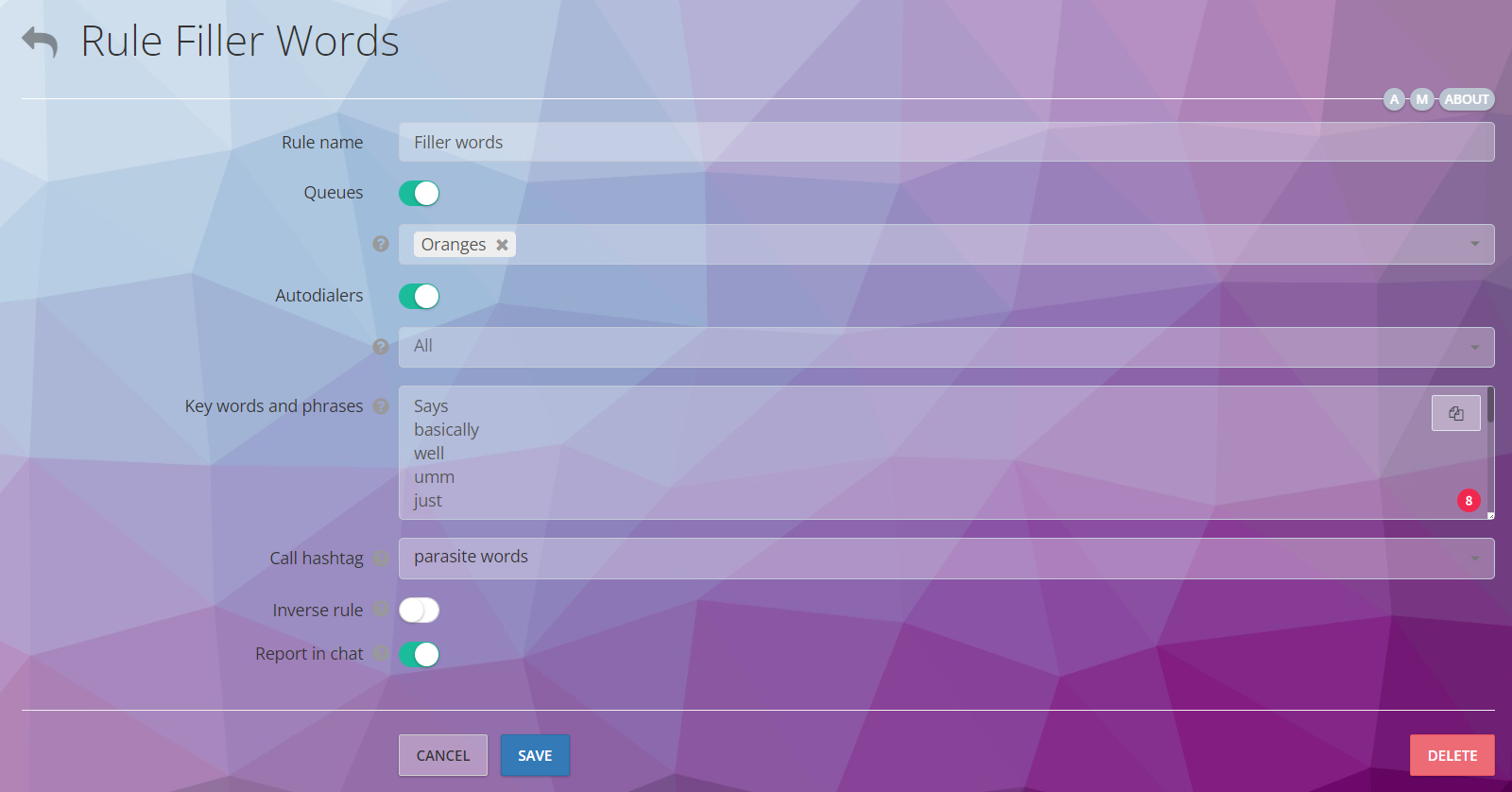 Oki-Toki’de konuşma analitiğini etkinleştirmek için KPI ve Disiplin bölümüne gidin, bir kural oluşturun ve gereken kuyrukları ve otomatik aramaları seçin.