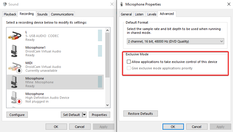 4. Özellikler penceresinde, Gelişmiş sekmesine geçin, Monopol Modu bölümünde, Monopol Modunu Kullan seçeneklerini devre dışı bıragın.