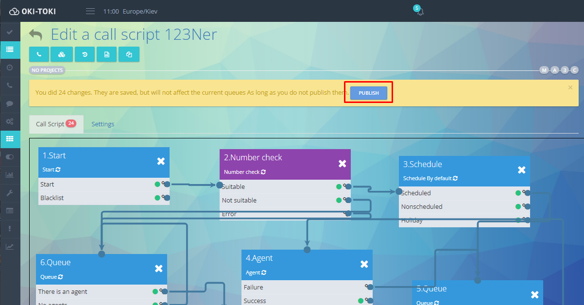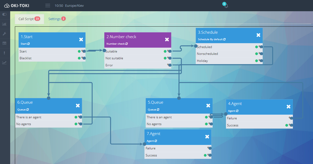 - Ortaya çıkan sabitlenmemiş küpü “Başlangıç” ve “Sıra” arasına bağlayın. Bu, çağrı başladıktan hemen sonra sistem çağrının sıraya girmeden önce numarayı kontrol etmesi için gereklidir;