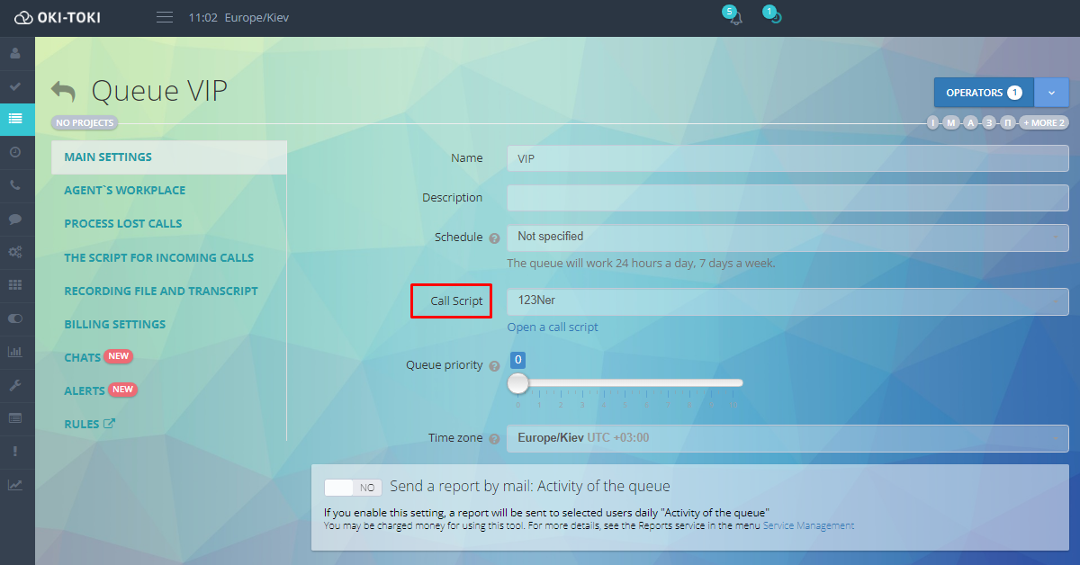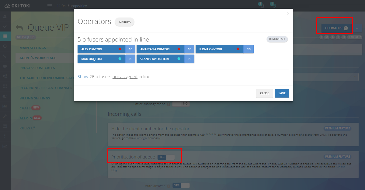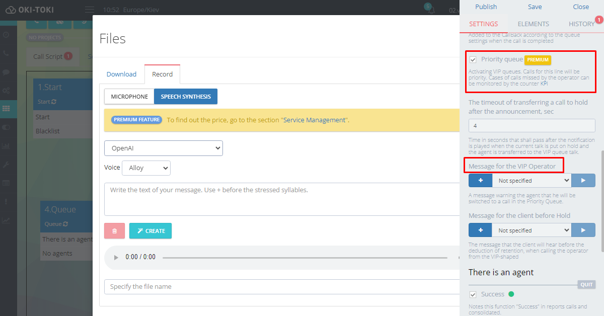 - “Sıra” küpünde Öncelikli Sırayı belirtin – bu VIP sırasını aktive eder, çağrının bekleme moduna geçiş zaman aşımını duyurudan sonra, VIP sırasına atanmış ajan için mesaj ve bekleme moduna geçecek müşteri için mesaj;