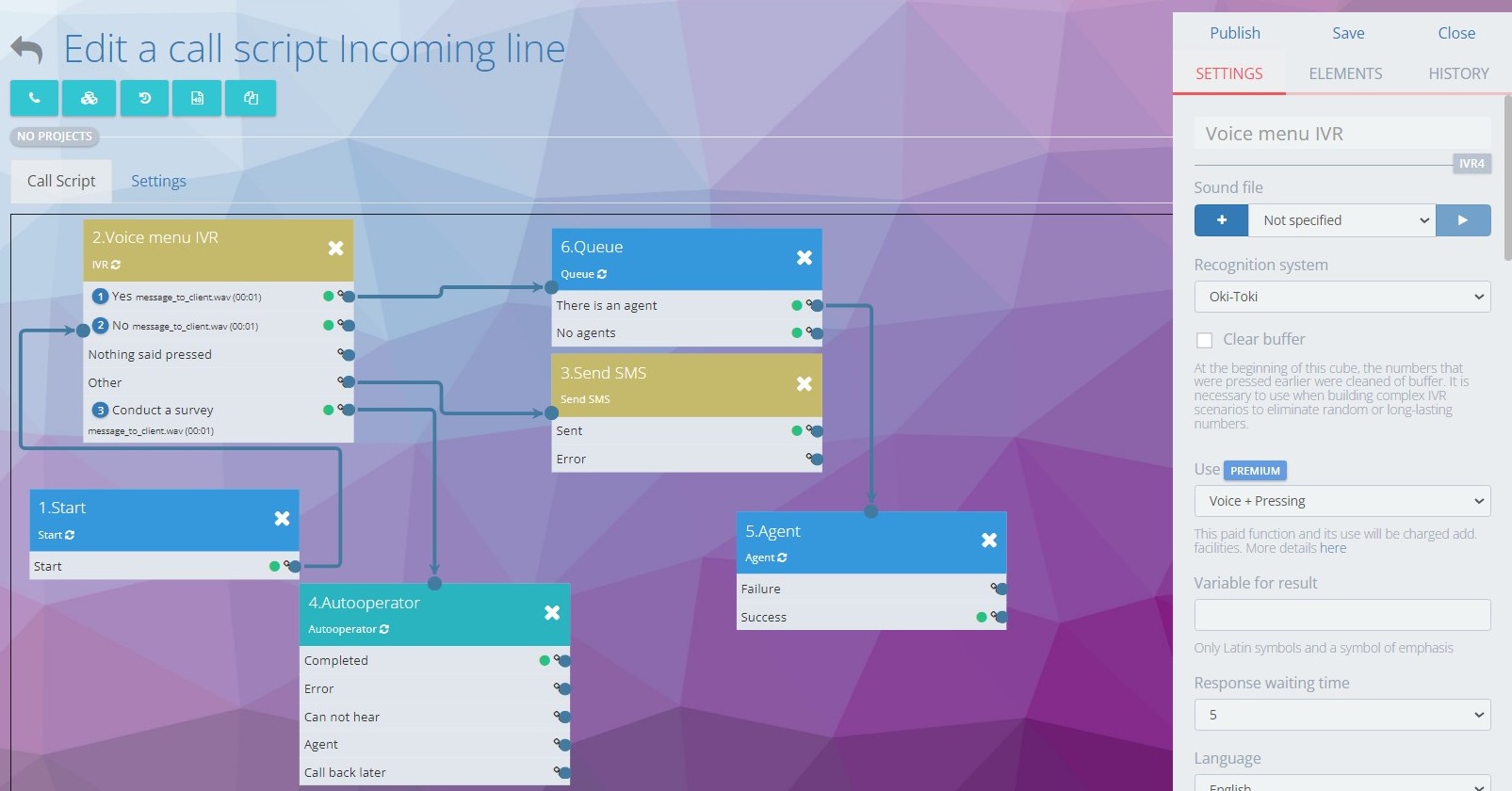 IVR (Etkileşimli Sesli Menü) – arama scriptiyle iletişim zincirini oluşturmanıza olanak tanıyan bir araç. IVR, müşteriye basit bilgiler sunar ve arama scriptine uyarak, müşteri yanıtlarını veya DTMF